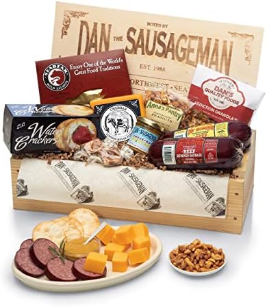 Amazon Com Dan The Sausageman S Favorite Gourmet Gift Basket Featuring Smoked Summer Sausage Savory Seabear Salmon Wisconsin Cheese Sweet Hot Mustard And Repurpose Wood Pine Crate Grocery Gourmet Food